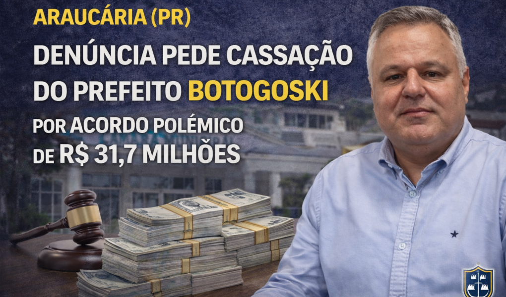 Araucária vive dias de tensão institucional. Uma denúncia formal protocolada na Câmara Municipal colocou o prefeito Luiz Gustavo Botogoski (PL) no centro de um imbróglio jurídico, político e financeiro que pode culminar na cassação de seu mandato. O caso envolve a assunção de uma suposta dívida de R$ 31.712.121,84 com a empresa Viação Tindiquera, em um acordo firmado sem decisão judicial definitiva, sem autorização do Legislativo e sem previsão orçamentária individualizada.